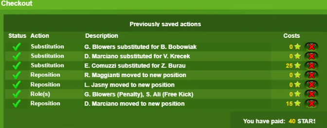 Das Protokoll zeigt die Liste der vorgenommenen Änderungen (Auswechslungen, Spielerbewegungen, Taktik, Markierungen und Rollenwechsel) und den Status jeder Änderung (fehlgeschlagen oder erfolgreich) an. Neben jeder Änderung werden auch die STARS-Kosten und unten die Gesamtkosten in STARS angezeigt.