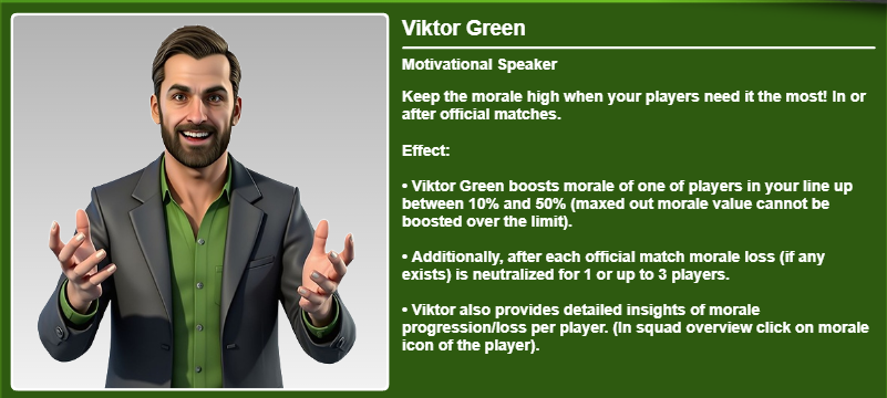 The Team Psychologist encourages your team in matches, in case of an impending defeat or after a defeat.