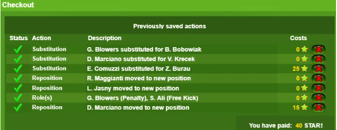 Le journal affiche la liste des changements effectués (remplacements, mouvements de joueurs, tactiques, marquages et changements de rôle) et le statut de chaque changement (échoué ou réussi). Vous verrez également à côté de chaque changement le coût en STARS et en bas le coût total en STARS.