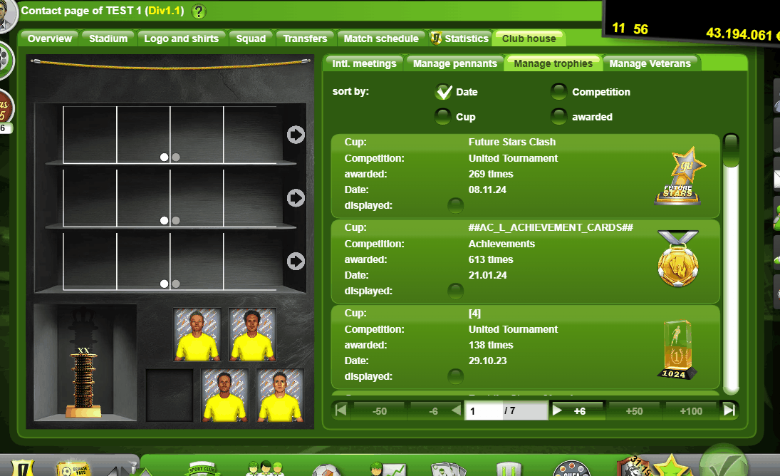 À gauche, vous verrez le Trophée et en bas, le Tableau des légendes. En cliquant sur les emplacements, vous ouvrirez une liste des joueurs qui ont pris leur retraite de votre club. Cliquez sur le joueur que vous souhaitez afficher et enregistrez. Pour supprimer un joueur du Tableau des légendes, cliquez sur le petit « x » rouge dans le coin droit.