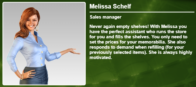 Avec Melissa, vous avez l'assistante parfaite et vous devez seulement fixer les prix de vos objets de collection. Elle répond également à la demande lors du réapprovisionnement (pour les articles que vous avez sélectionnés) et elle est toujours très motivée.