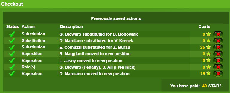 Dziennik wyświetla listę wprowadzonych zmian (zmian, przesunięć zawodników i zmiany ról) oraz status każdej zmiany (nieudana lub udana). Obok każdej zmiany zobaczysz również koszt w GU GWIAZDACH, a na dole całkowity koszt w GU GWIAZDACH.