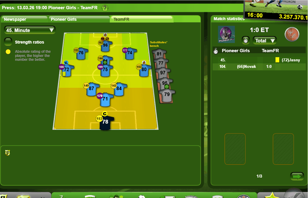 Wartość ofensywna: Im więcej napastników dasz na boisko, tym większa będzie wartość ofensywna. Taktyka ofensywna też pomaga. Im wyższa wartość, tym więcej będziesz mieć okazji.