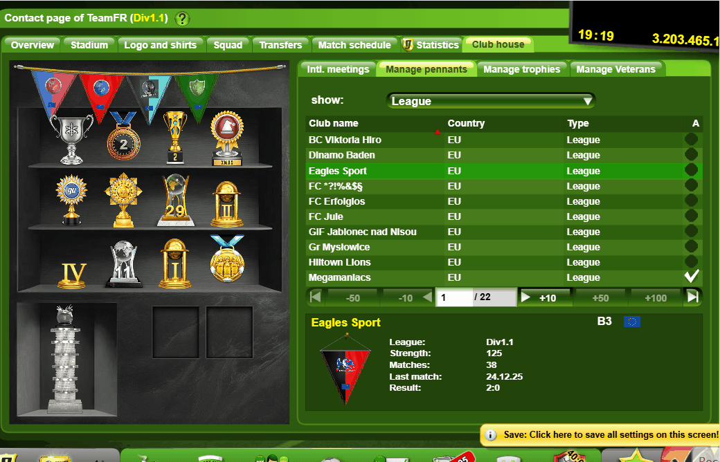 W sekcji klubu swojego klubu możesz przeglądać i zarządzać swoimi trofeami, proporczykami i weteranami.