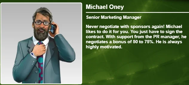 Michael Oney jest światowej klasy negocjatorem, jeśli chodzi o najlepsze oferty sponsorskie dla Twojego klubu. Wraz z Twoim PR Menedżerem będzie negocjował bonus w wysokości od 50% do 75%. Następnie wystarczy podpisać umowę. Jest zawsze bardzo zmotywowany.