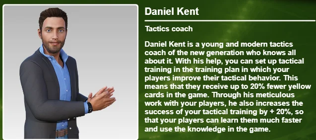 Daniel Kent zwiększa również skuteczność taktyczną Twojego treningu taktycznego o 20%, dzięki czemu Twoi zawodnicy mogą szybciej się go nauczyć i wykorzystać w meczach..