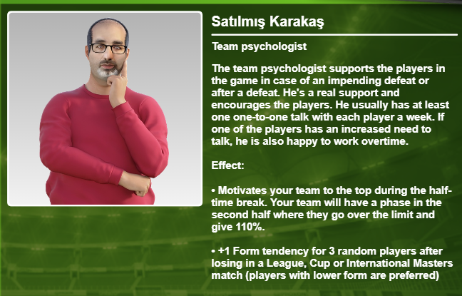 Kiedy jest aktywny w Twoim klubie, jeden z zawodników (wybrany losowo) może otrzymać wzrost morale od 10% do 50% (wzrost jest doliczany do aktualnego poziomu morale zawodnika: np. jeśli zawodnik ma 56 punktów morale i otrzyma 18% wzrostu, jego nowy poziom morale wyniesie 66).