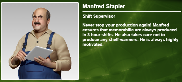 Manfred Stapler, sumienny i oddany pracownik, który zapewnia regularną produkcję pamiątek w fabrykach. Pod jego nadzorem linie produkcyjne nigdy nie będą stały puste.