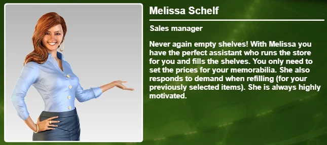 Dzięki Melisie masz idealnego asystenta i musisz tylko ustawić ceny swoich pamiątek, ona zareaguje również na zapotrzebowanie podczas uzupełniania półek i zawsze jest maksymalnie zmotywowana.