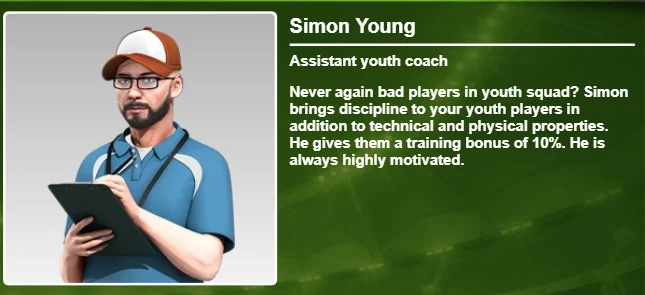 Simon Young jest ekspertem w sprawach młodzieży i dyscyplinuje wszystkich juniorów dzięki swoim umiejętnościom. Z nim Twoi juniorzy otrzymają 10% bonusu do treningu. Jest on zawsze maksymalnie zmotywowany.