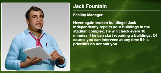 Jack Fountain, jest osobą którą potrzebujesz, jeśli szukasz asysty przy zarządzaniu budynkami i utrzymaniu ich w dobrej kondycji. Co 10 minut sprawdza, czy którykolwiek z budynków wymaga naprawy. Oczywiście w każdej chwili możesz interweniować, jeżeli nie będą satysfakcjonować Cię jego priorytety.